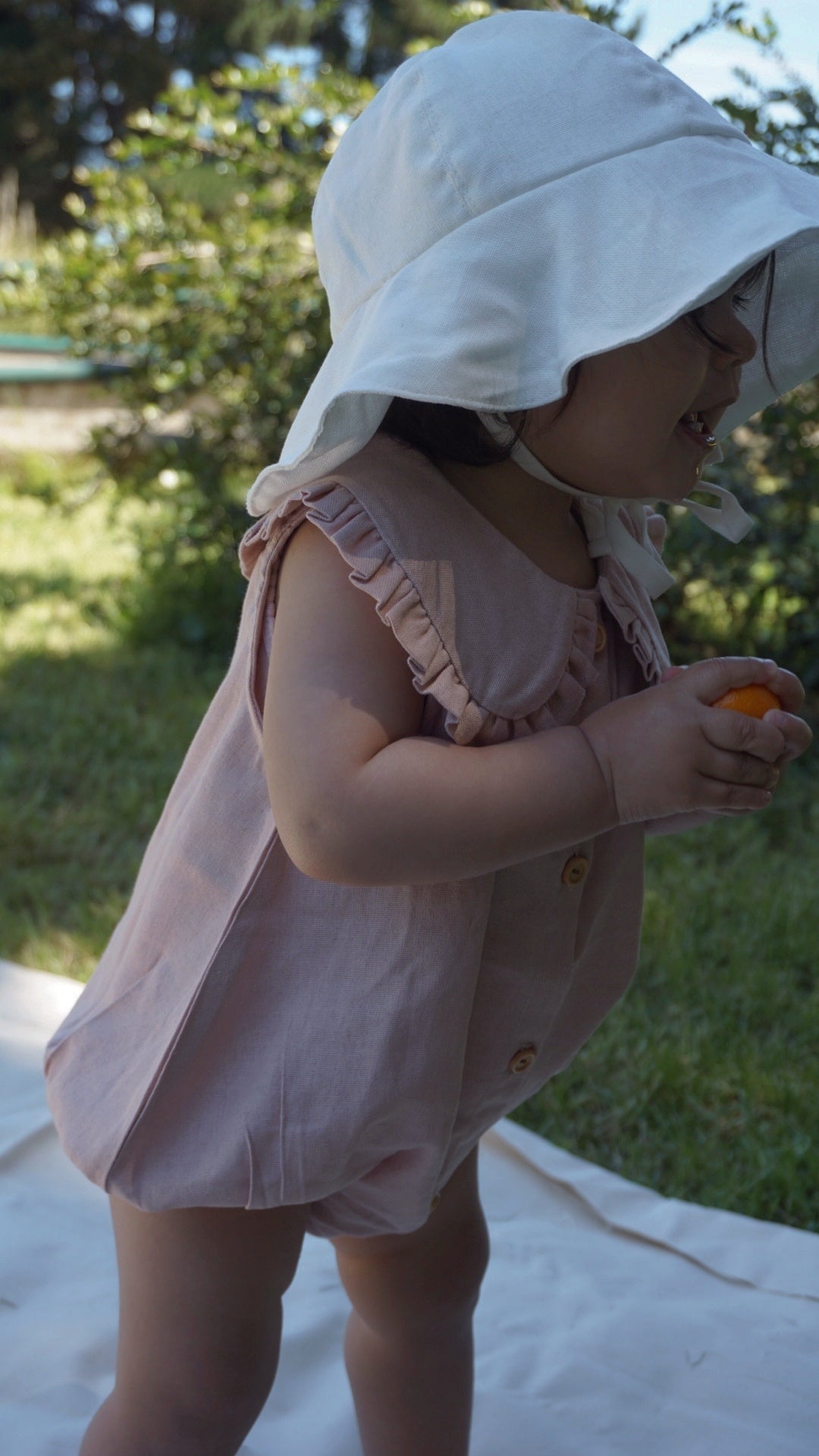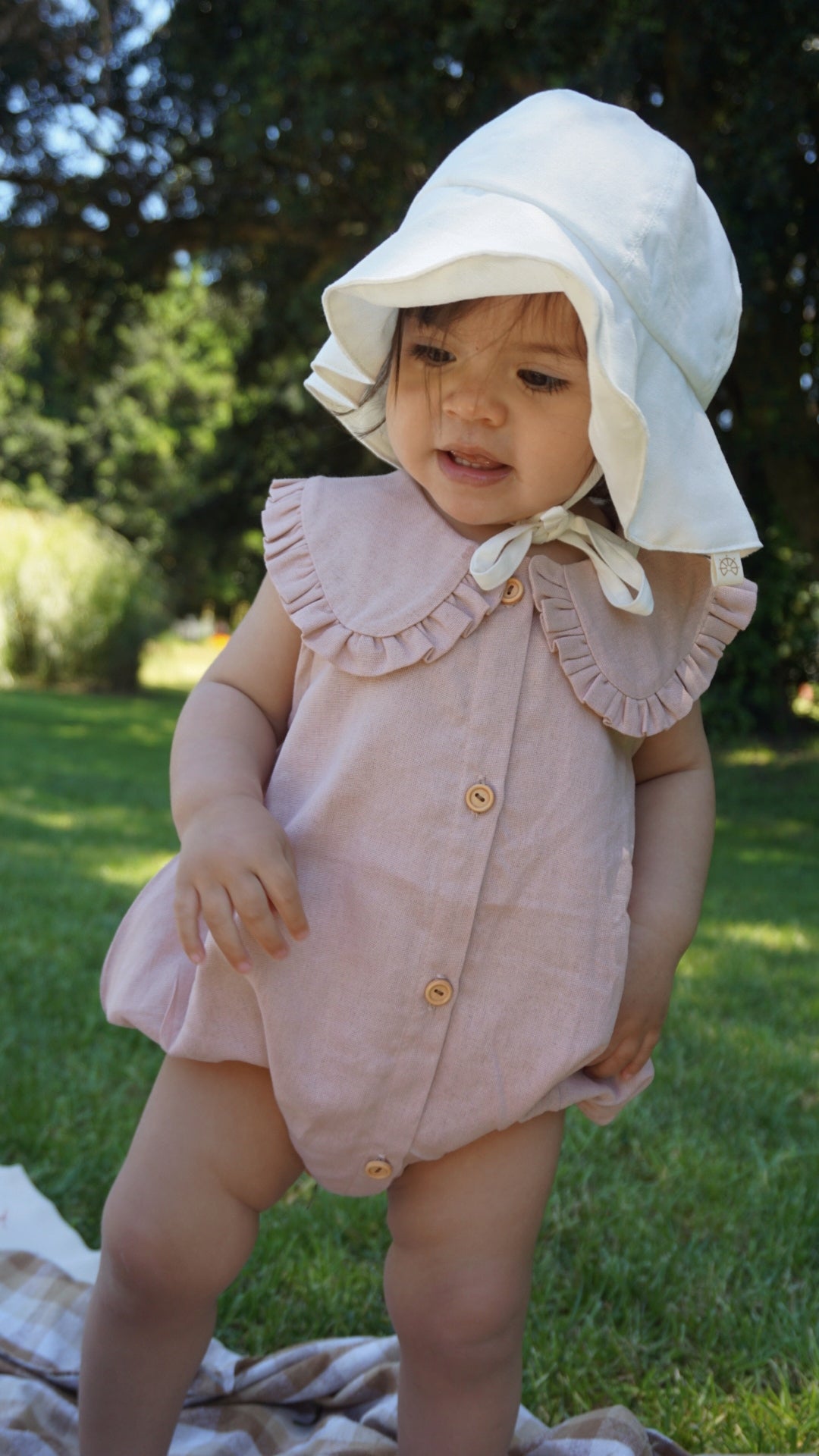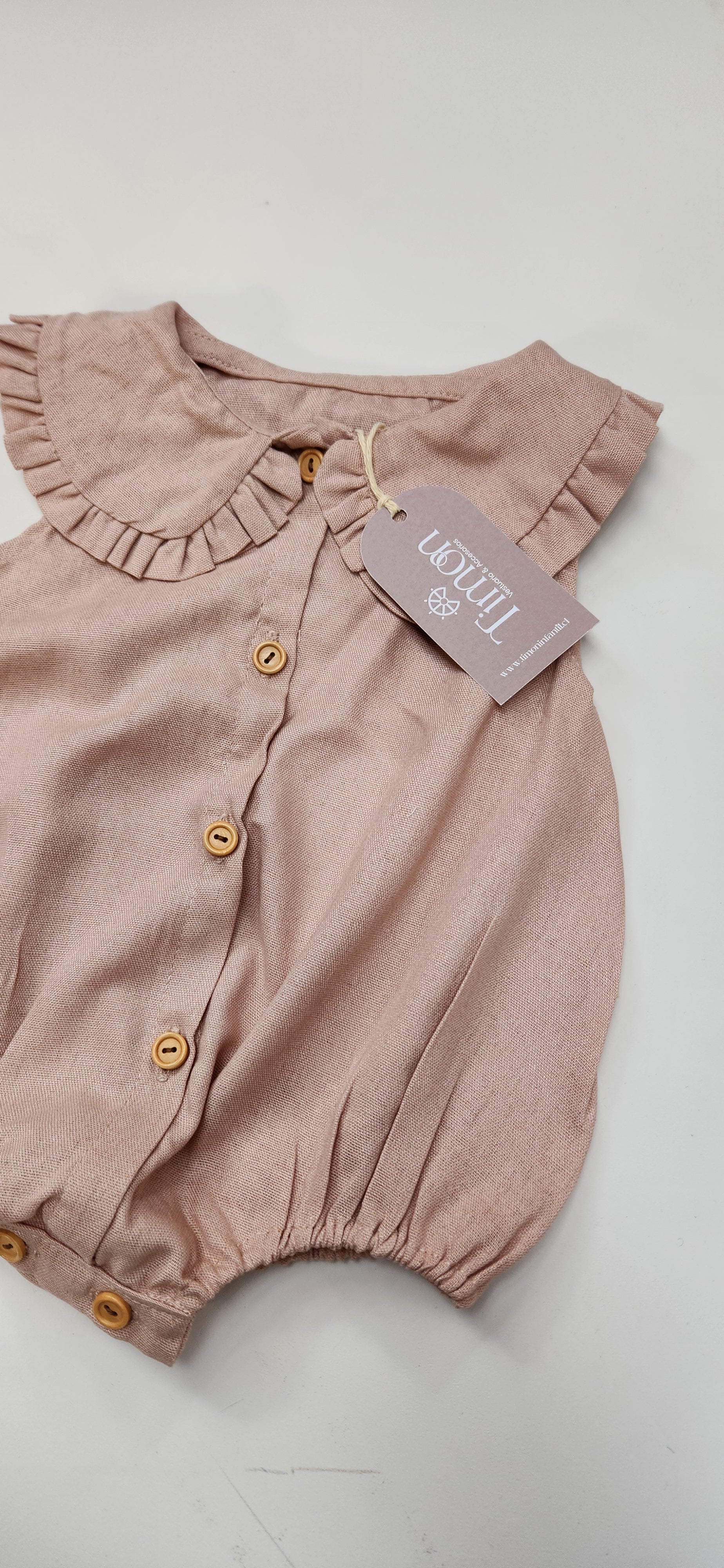 Diseño único confeccionado en lino rosa viejo. Ideal para los dias en que necesitas vestir a tu guagua y que esté comoda y fresquita todo el día.