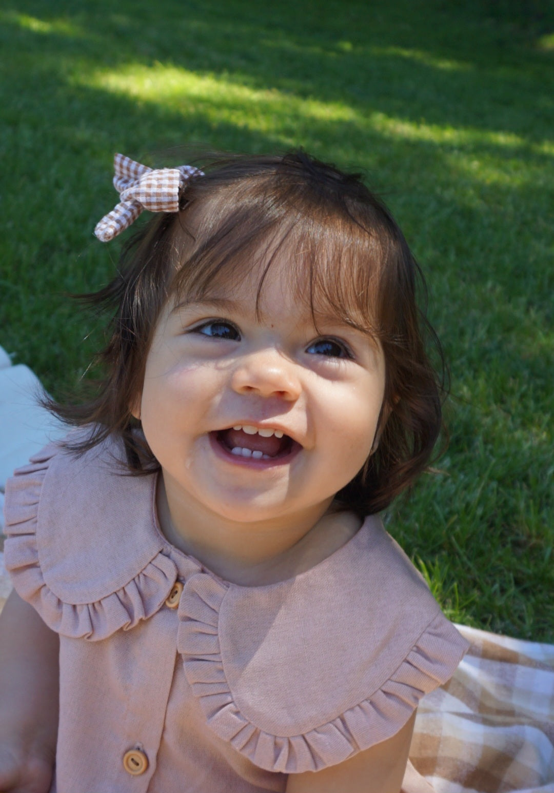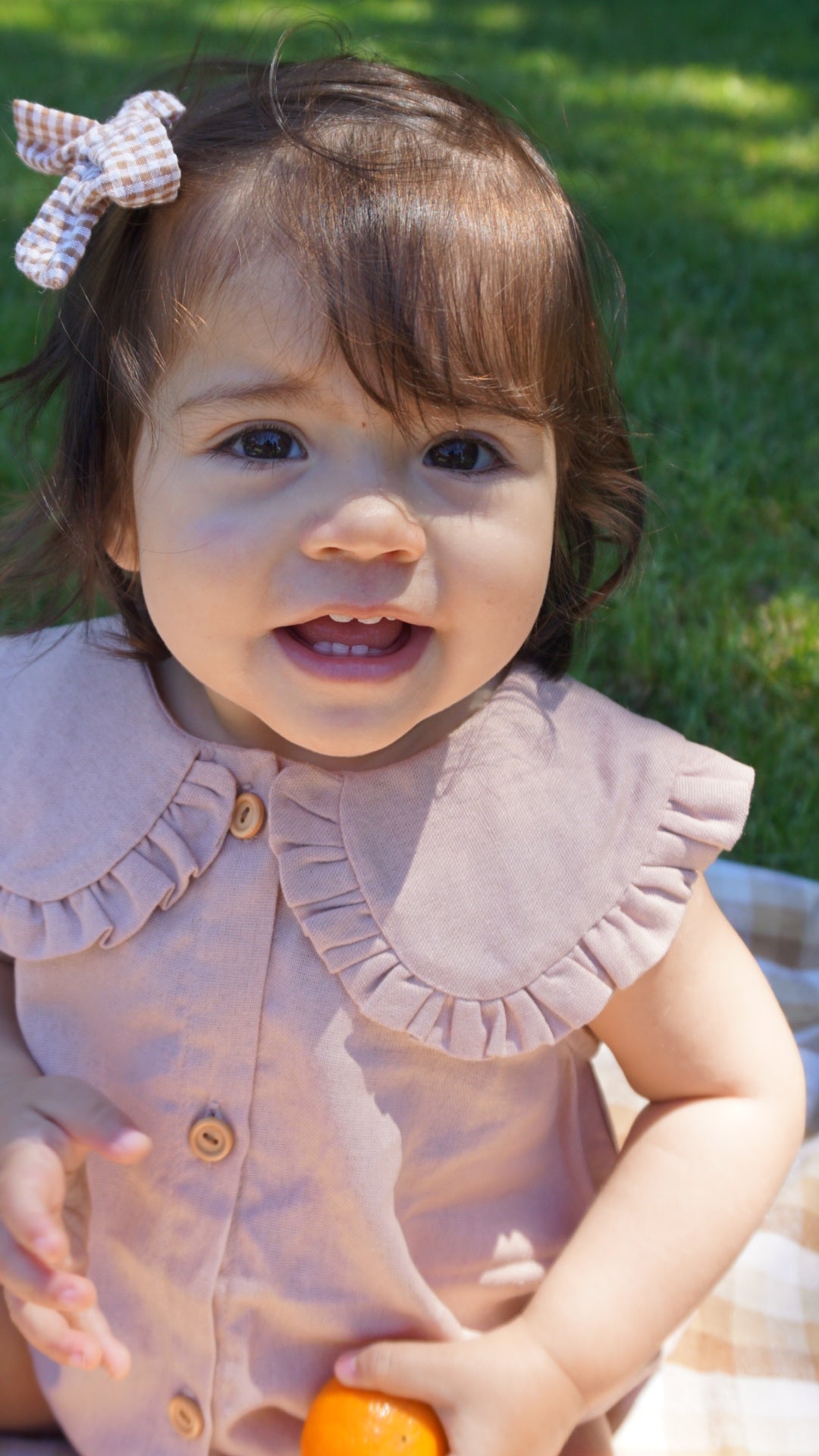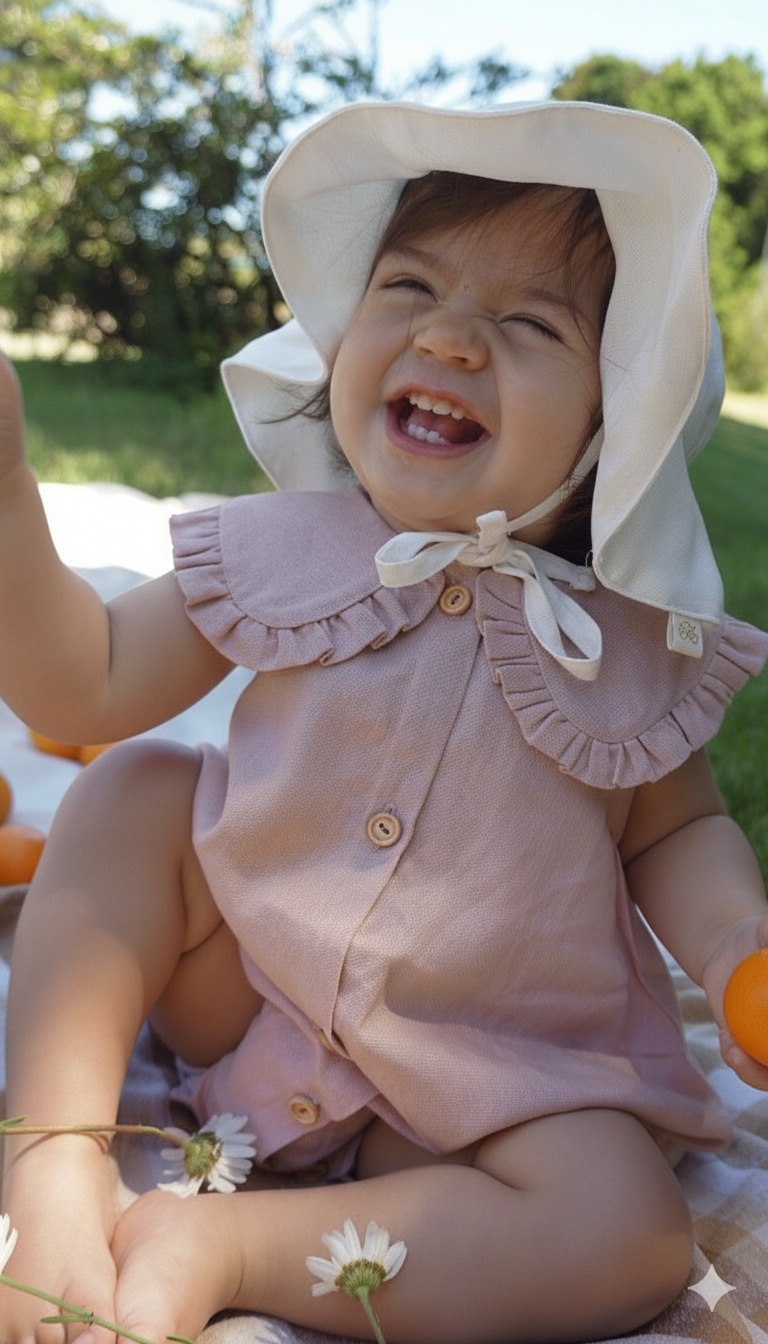 Diseño único confeccionado en lino rosa viejo. Ideal para los dias en que necesitas vestir a tu guagua y que esté comoda y fresquita todo el día.