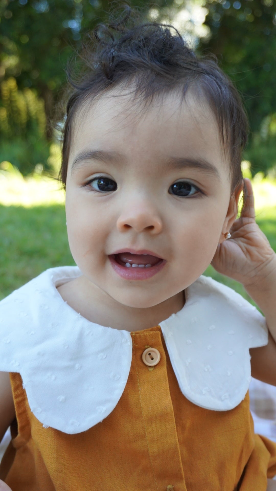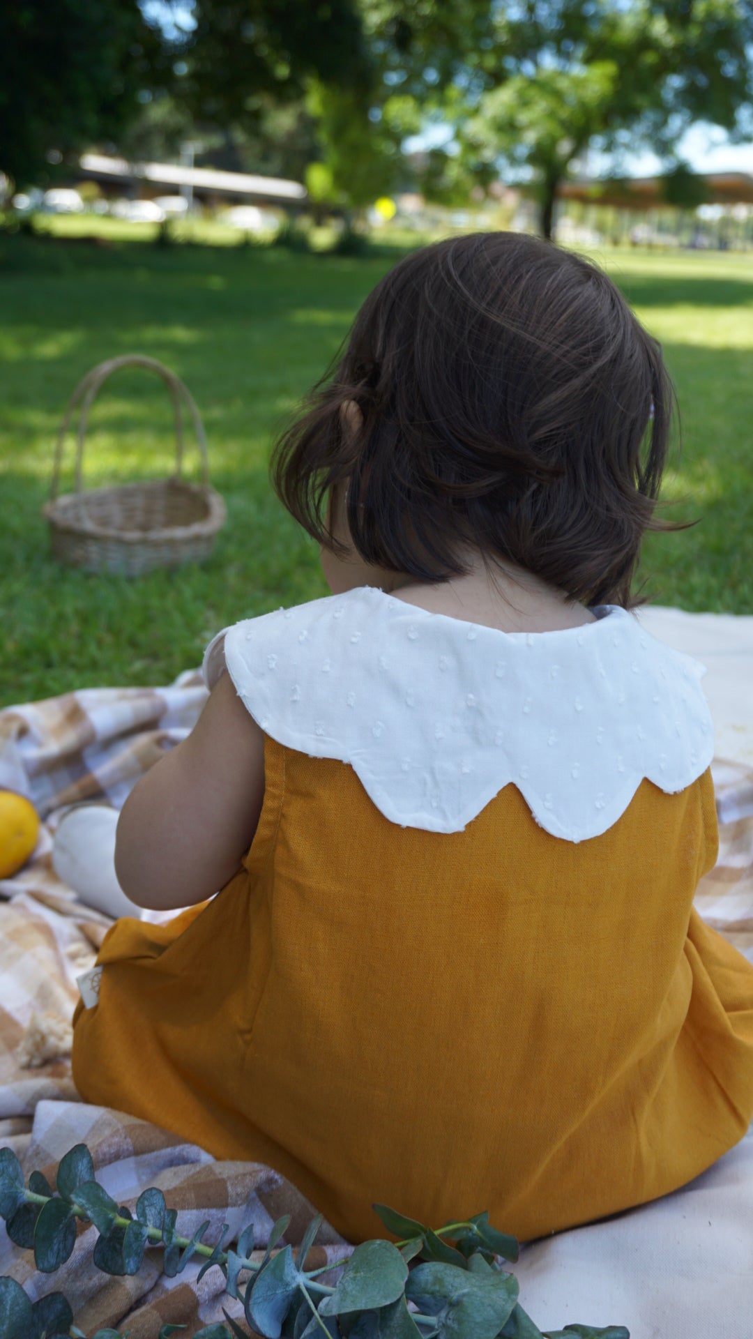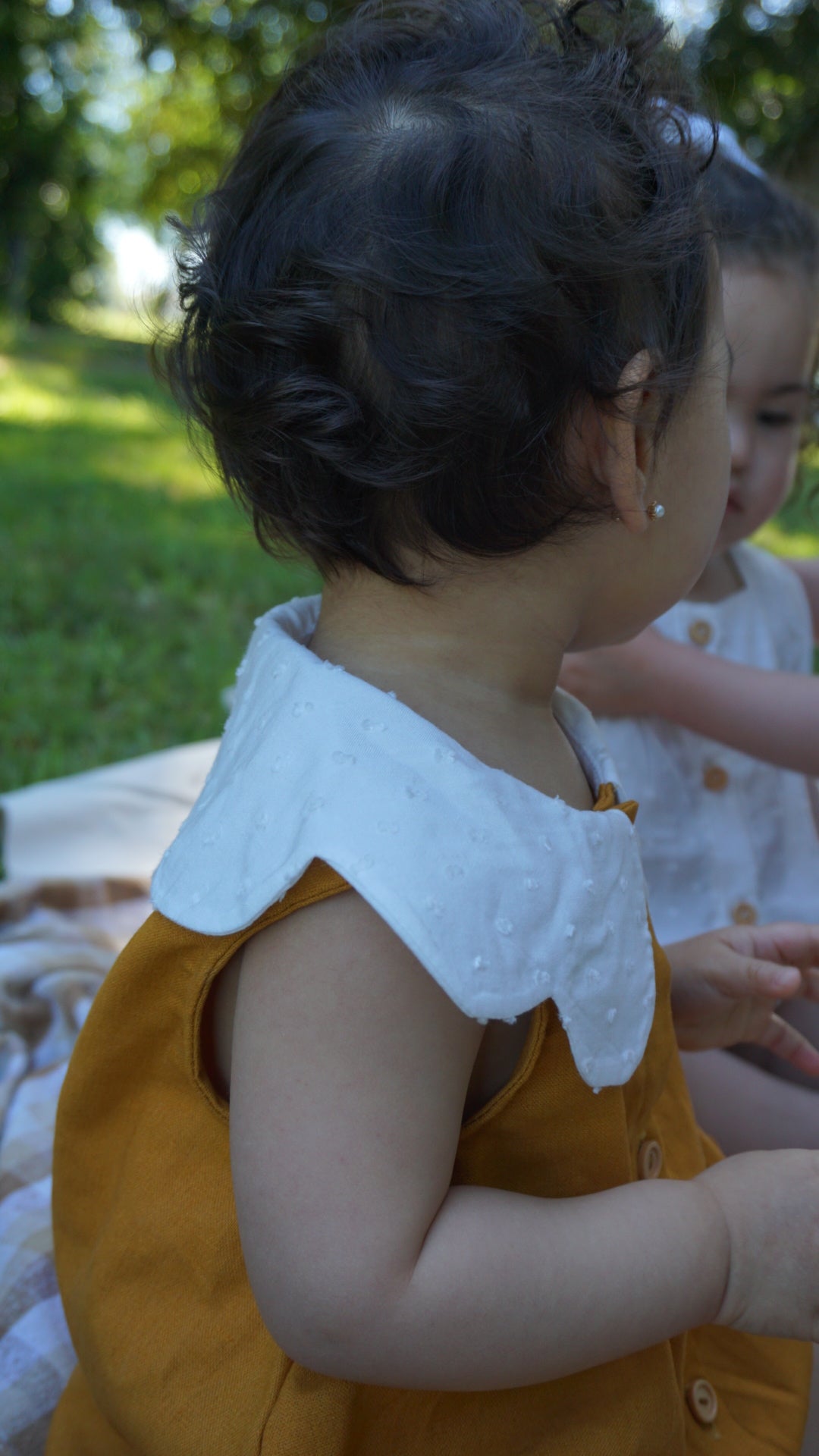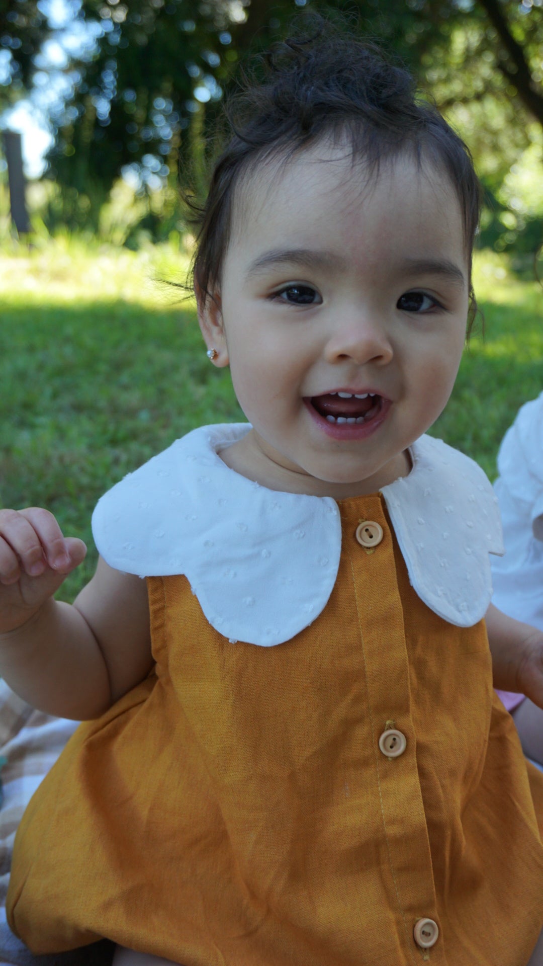Diseño único y exclusivo inspirado en las margaritas, su tela base es lino mostaza intenso y un cuello que enamora en un suave algodón texturizado,tiene botones de madera frontal y en entrepierna para facilitar la muda de tu bebé. Su diseño es holgado y tiene elástico en sus piernas para mayor comodidad.