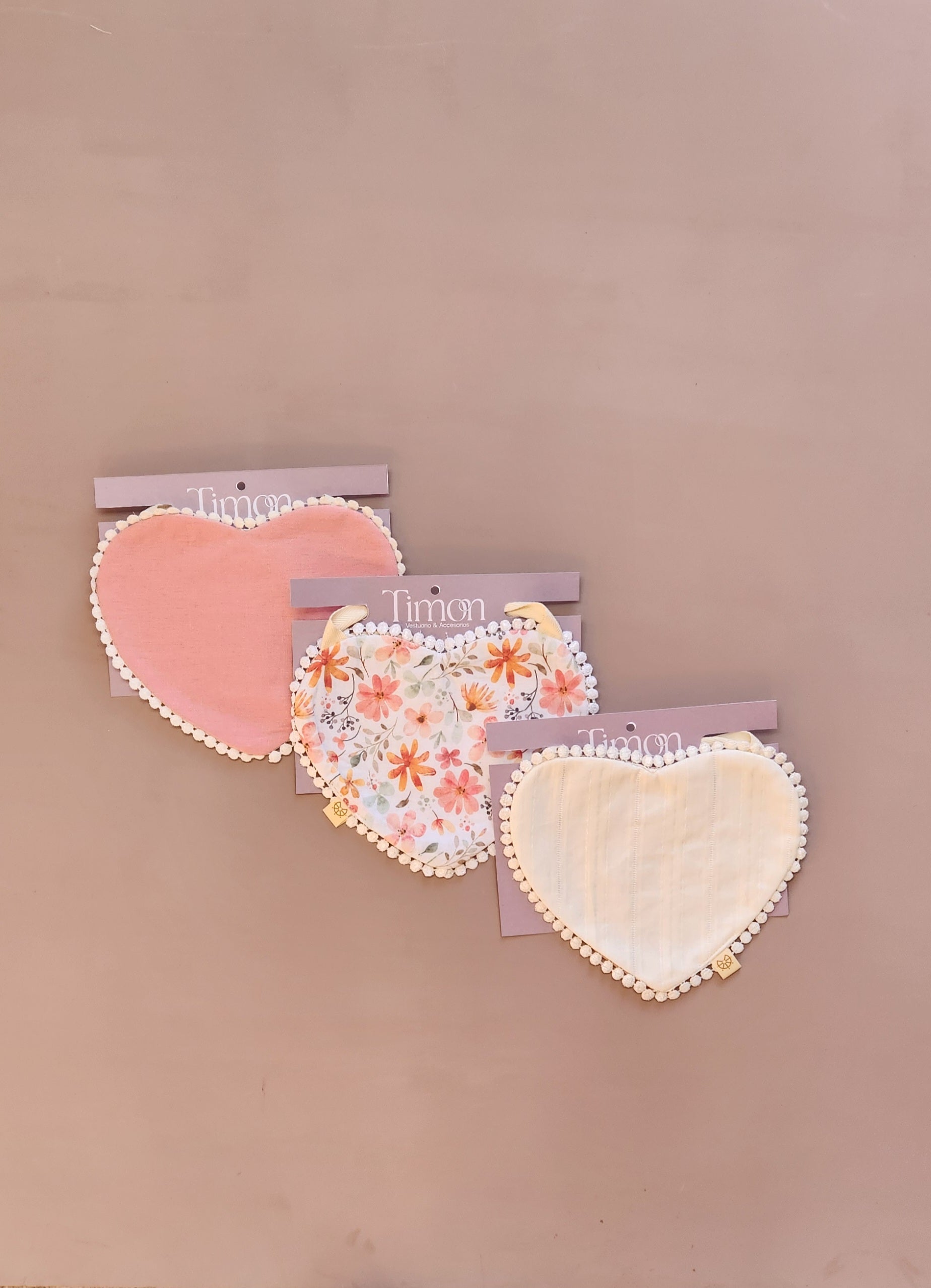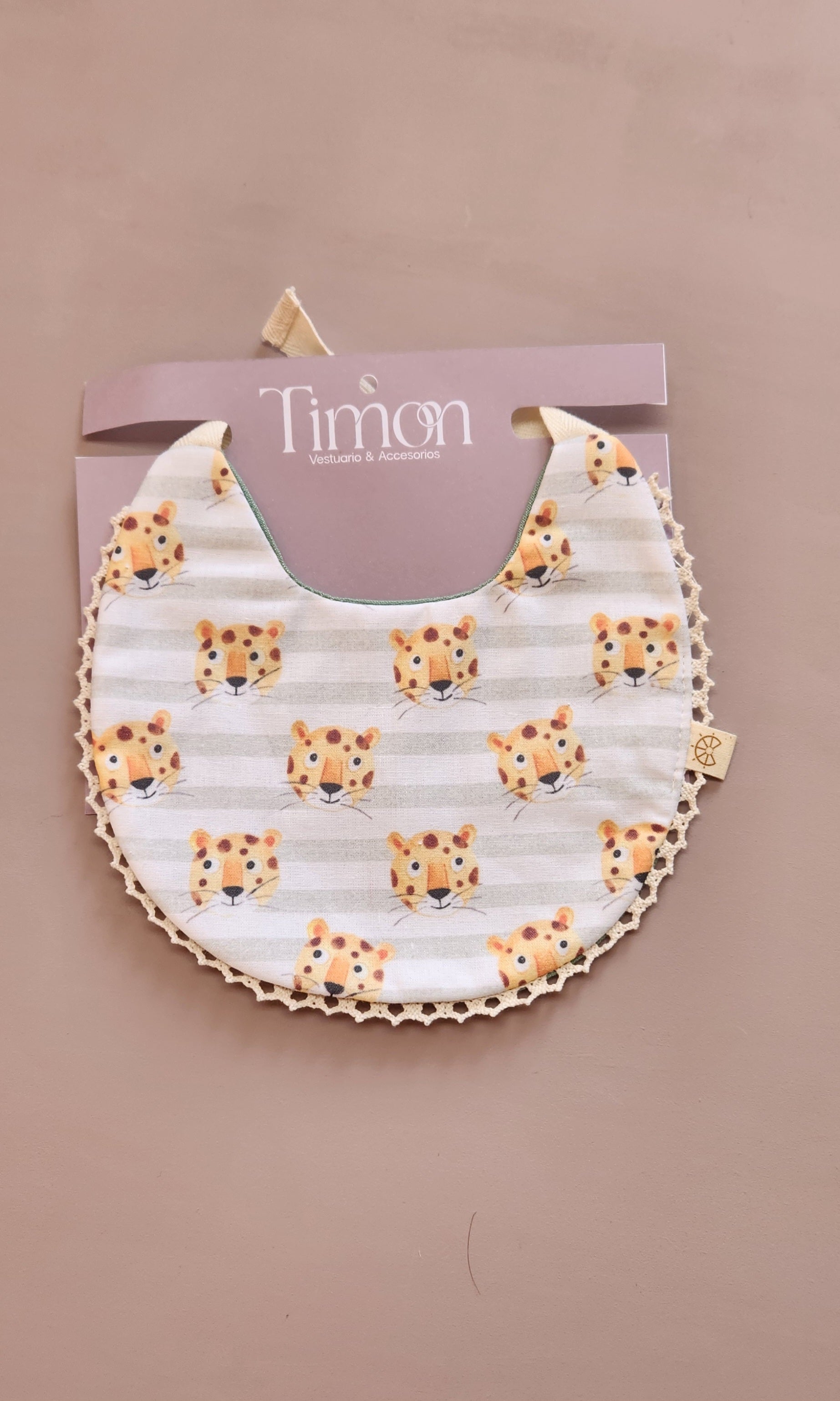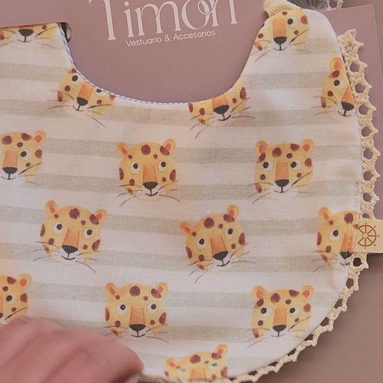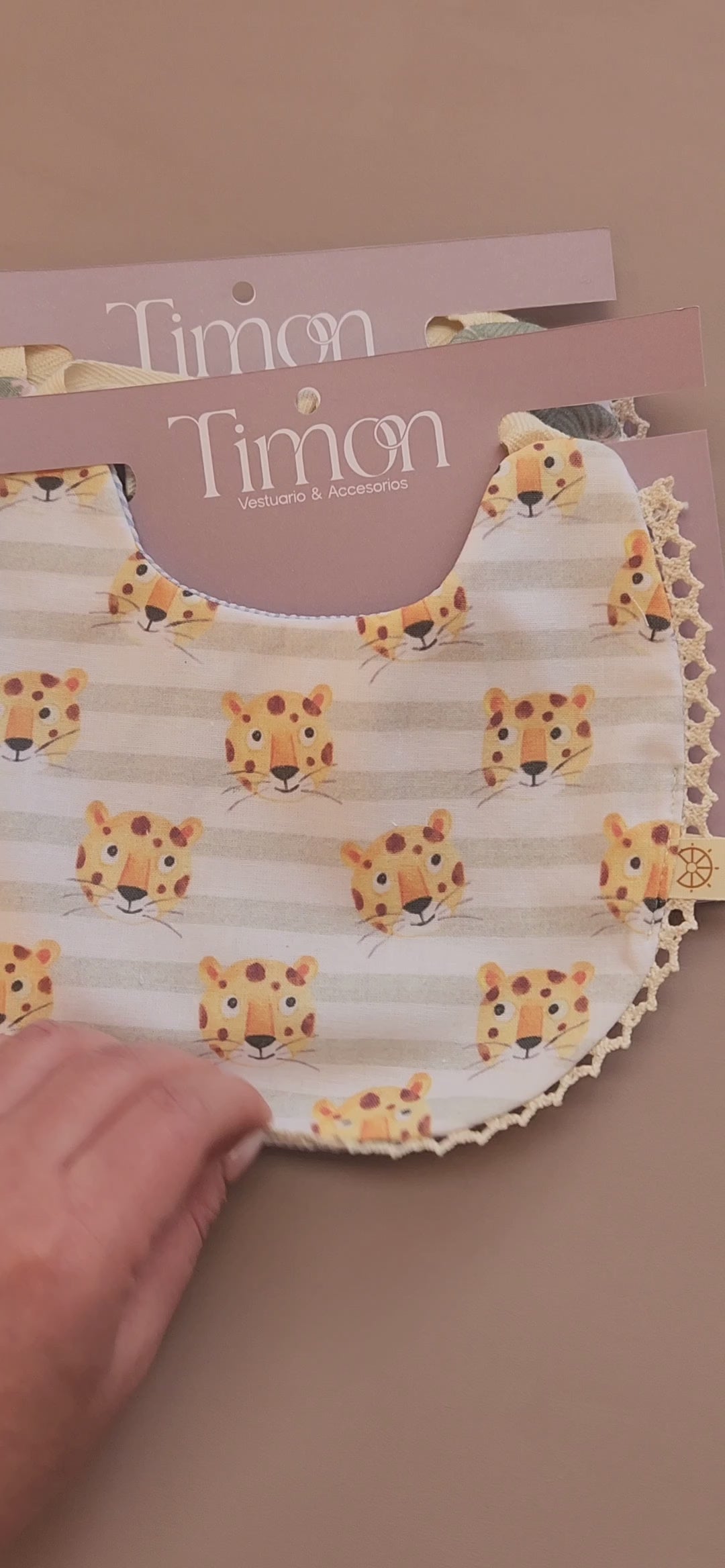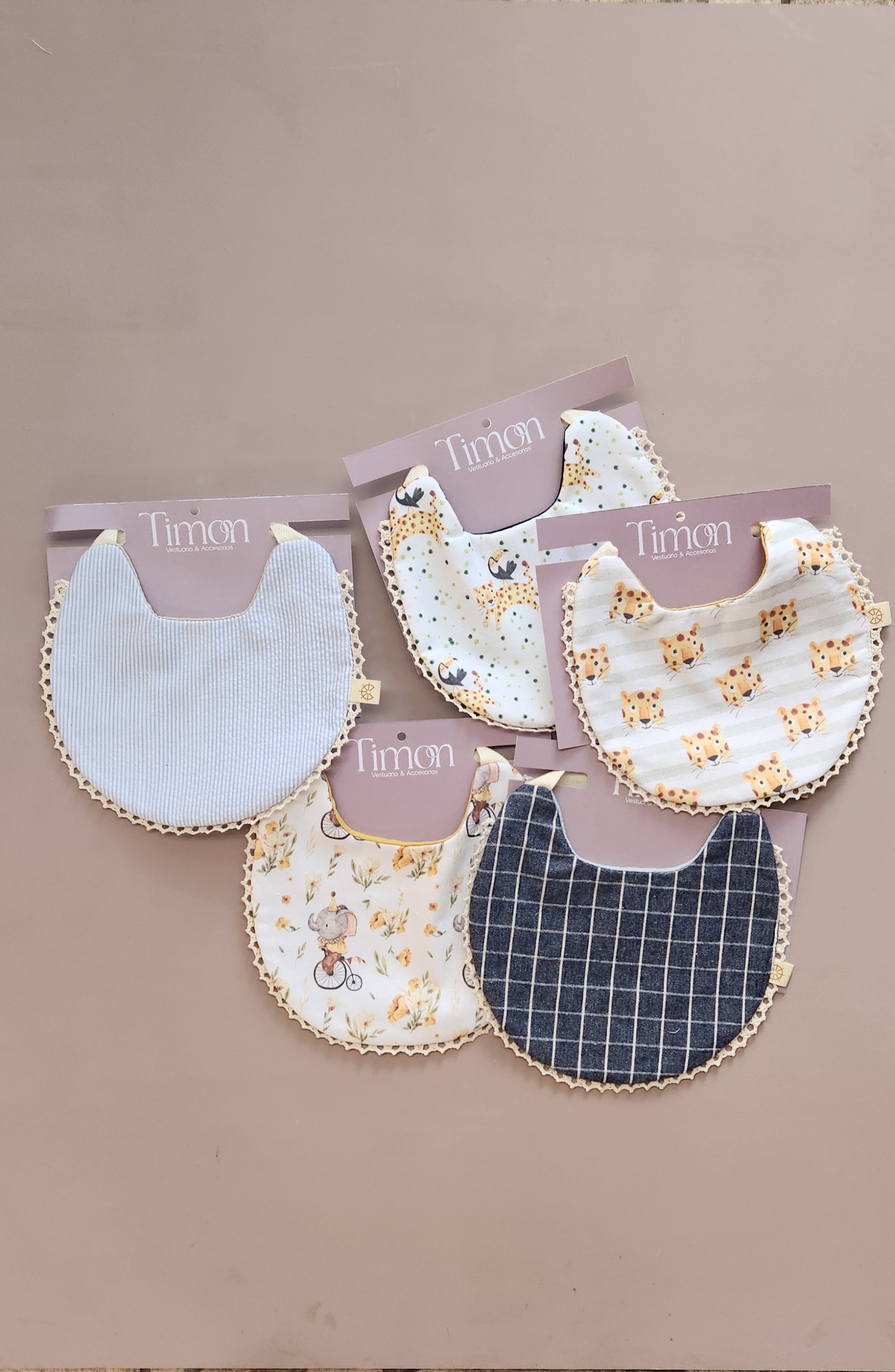 Baberos reversibles (tiene un color o estampado distinto en cada cara) un bolillo de pelotitas color blanco invierno por el contorno en caso de babero corazon. Y bolillo tejido en el caso de baberos redondos