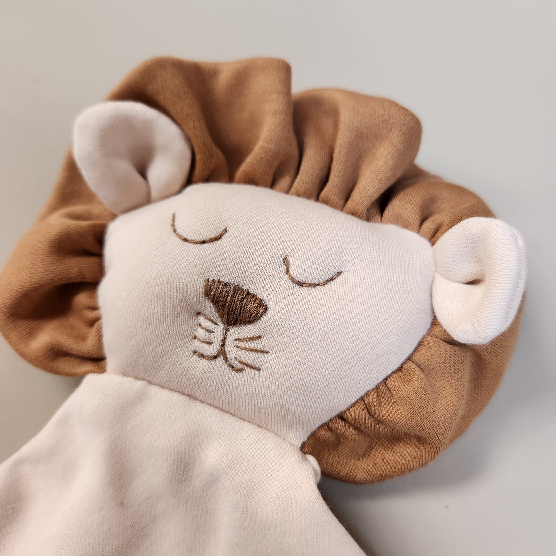 Confeccionado en 100% algodón pima peruano color beige/coffe con detalles bordados a mano en hilo 100% algodón DMC coffe.
